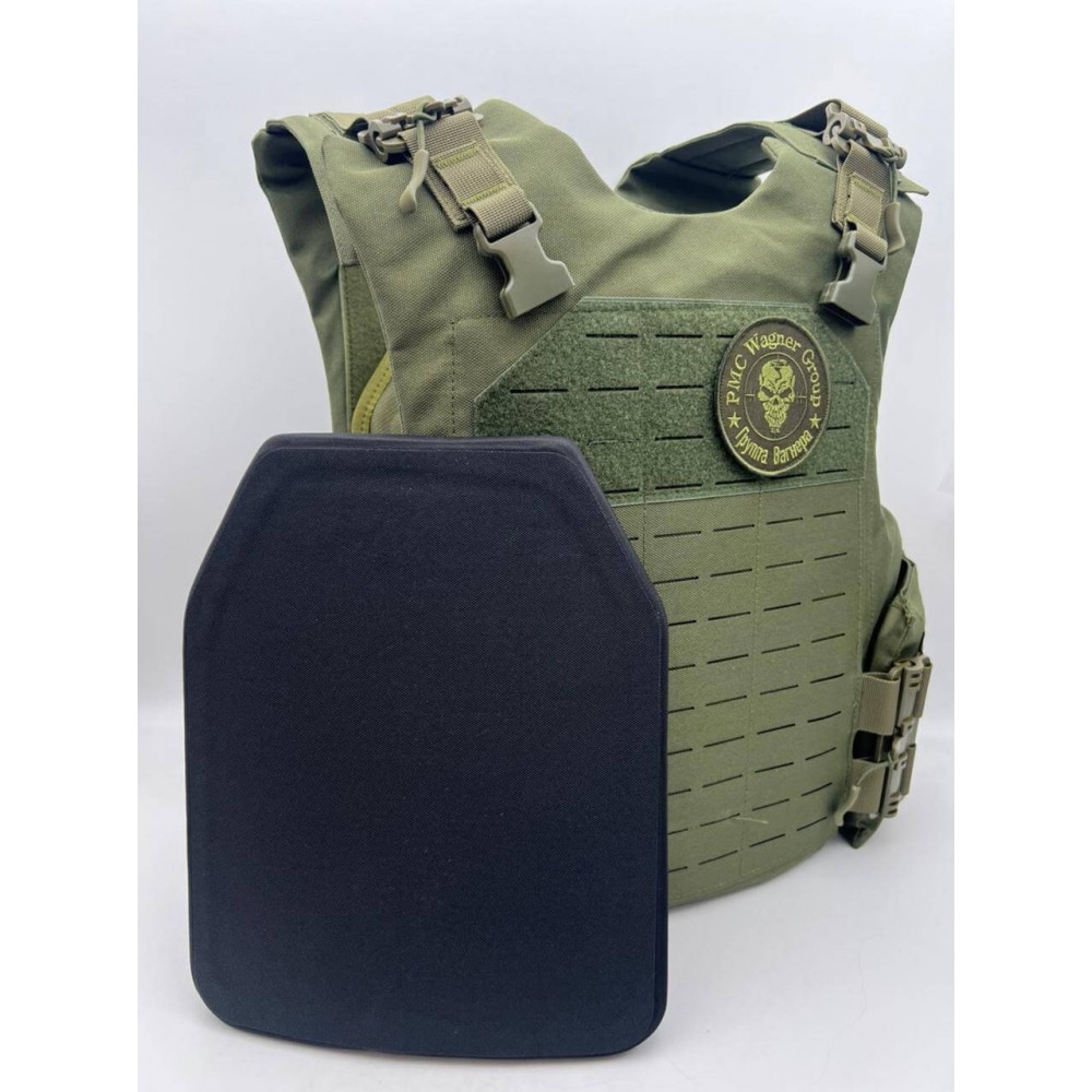 Передняя и задняя бронепластины изготовлены из керамической пластины из оксида алюминия в сочетании с высокомолекулярным полиэтиленом. Размер каждой бронепластины составляет 22х250х300 мм, а их вес равен 2,80 кг каждая. Они обеспечивают высокую степень защиты в важных зонах тела.