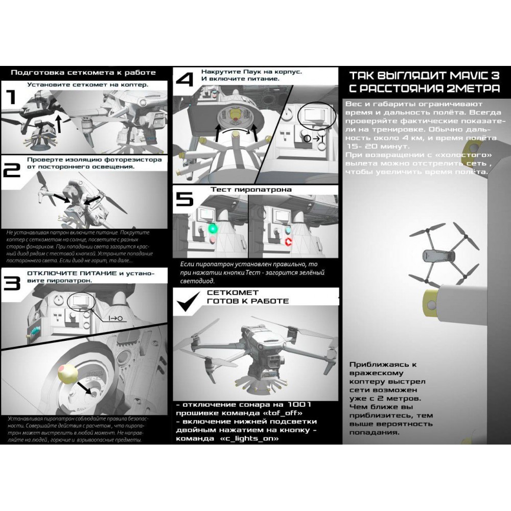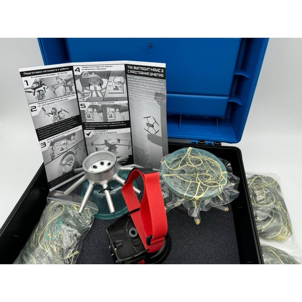 Сеткосброс/сеткомет «Тарантул» разработан для захвата квадрокоптеров. Устанавливается в качестве дополнительного оборудования на квадрокоптеры DJI Mavic 3, DJI Mavic 2, Autel EVO 2, Uco и может быть смонтирован на FPV. Активируется с помощью подсветки. Многоразового использования.